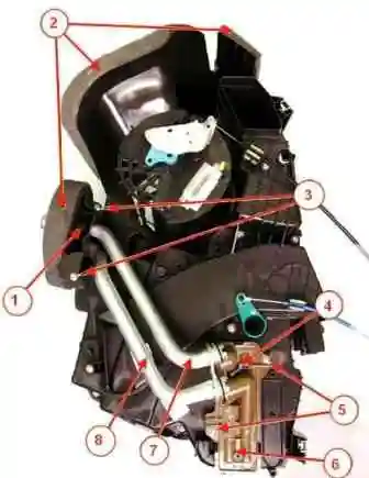 Головкой Torx T20 откручиваем два винта 6, отжимаем три фиксатора 5 и извлекаем радиатор 4 из корпуса отопителя.