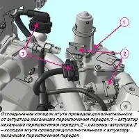 Головкой на 13 отвернуть два болта 1, рисунок 1, крепления, снять цилиндр 2 гидропривода сцепления, не отсоединяя от трубки 3 гидропривода, и подвесить цилиндр на технологический крючок.