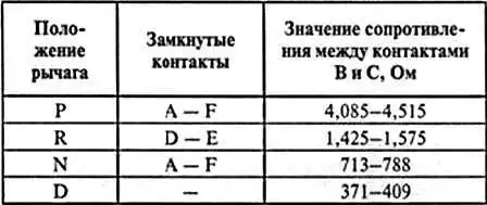 Тестером в режиме омметра проверяем при различных положениях рычага датчика замыкание соответствующих контактов (показано на снятом датчике)