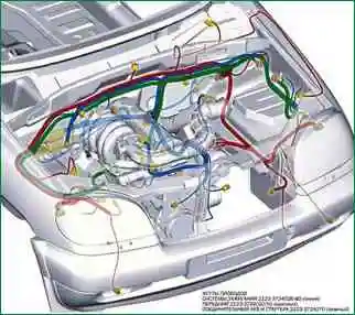Так как система автомобиля имеет однопроводную схему, то минусовой провод жгутов проводов крепится к кузову автомобиля.