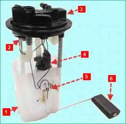 Модуль электробензонасоса (рис. 3) включает в себя электробензонасос турбинного типа, регулятор давления топлива, сетчатый фильтр, фильтр грубой очистки топлива и датчик уровня топлива.