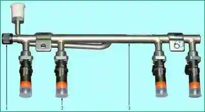 На рампе форсунок (рис. 7) расположен штуцер 1 для контроля давления топлива, закрытый резьбовой пробкой.