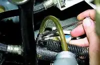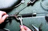 Сжав амортизатор, выводим его шток из отверстия кронштейна.