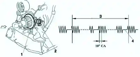 Датчик угла поворота коленчатого вала (рис. 1) выводит сигналы вращения коленчатого вала каждые 10°, недостающие зубья используются для определения верхней мертвой точки.