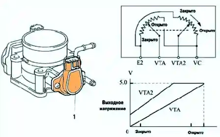 Один сигнал (VPA) линейного изменения напряжения во всем диапазоне угла поворота педали управления подачей топлива, другой – сигнал (VРA2) напряжения смещения.