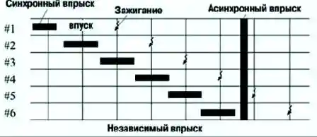 - b) асинхронный впрыск, при котором впрыск топлива производится при обнаружении запросов по сигналам датчиков независимо от угла поворота коленчатого вала.