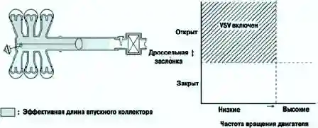 Когда управляющий клапан открыт, эффективная длина впускного коллектора уменьшается, и пиковая эффективность впуска смещается в область высоких оборотов двигателя, таким образом, обеспечивая большую мощность в этой области.