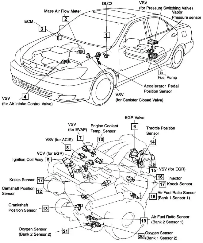 Основные элементы системы управления двигателем 1МZ-FE представлены в таблице