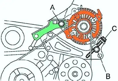 Проверив натяжение приводного ремня, окончательно дотяните болт "В". Момент затяжки: 9.8 Нм.