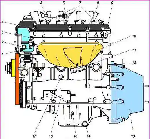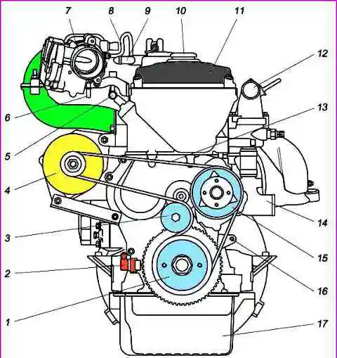 Вигляд двигуна ЗМЗ-40524 спереду: 1 - шків-демпфер колінчастого валу; 2 - датчик положення колінчастого валу; 3 - автоматичний натяжний пристрій; 4 – генератор; 5 - паливна магістраль із форсунками; 6 - штуцер приєднання шлага від адсорбера; 7 – дросельний модуль з електроприводом; 8 - шланг малої гілки вентиляції картера; 9 - трубка основної гілки вентиляції картера; 10 - кришка маслоналивного патрубка; 11 – кришка клапанів; 12 - патрубок відведення охолоджуючої рідини радіатор; 13 – ремінь приводу агрегатів; 14 - патрубок підведення охолоджувальної рідини з радіатора; 15 - водяний насос із електромагнітною муфтою; 16 - точка кріплення дроту "-" від кузова автомобіля; 17 - олійний картер