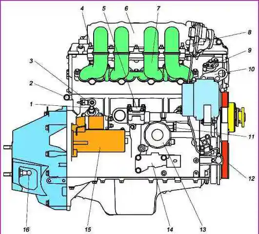 Правий бік двигуна ЗМЗ-40524: 1 - патрубок відведення охолоджуючої рідини в обігрівач; 2 - патрубок підведення охолоджуючої рідини з обігрівача; 3 датчик детонації; 4 - точка кріплення дроту «-» КМПСУД та дроту «-» з кузова автомобіля; 5 - кришка приводу масляного насоса; 6 – ресивер; 7 - впускна труба; 8 - точка кріплення дроту «-» КМПСУД; 9 - кришка верхнього гідронатягувача; 10 - передній кронштейн підйому двигуна; 11 – термоклапан; 12 - кришка нижнього гідронатягувача; 13 - масляний фільтр; 14 – кронштейн правої опори двигуна; 15 – стартер; 16 - опора вилки вимикання зчеплення