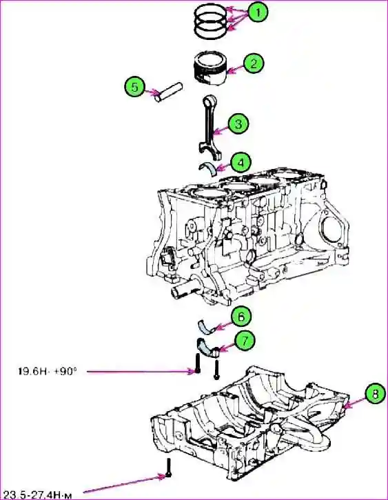 Встановити шатунну кришку та затягнути болти кріплення моментом затягування 19,6 Нм + 90˚.