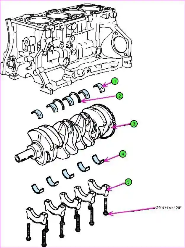 Встановити всі кришки корінних опор та затягнути болти кріплення з моментом затягування 29,4 Нм + 120˚