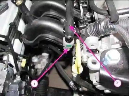 Натискаємо на пружинний фіксатор з'єднувача та від'єднуємо підвідний трубопровід 1 (рисунок 2), від паливної рампи 2