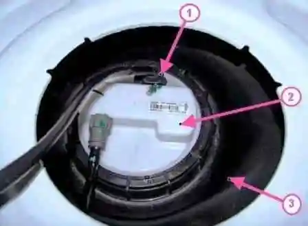 Від'єднуємо колодку 1 (рис.1), джгута проводів заднього від модуля 2 електробензонасоса.