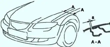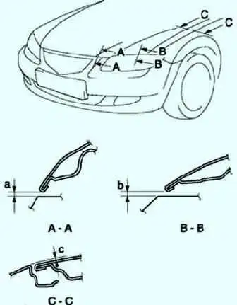 Перевірте зазор між капотом та корпусом (кузовом) у перерізі, показаному на малюнку 3.