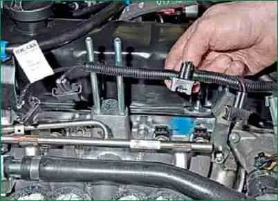 Потягнувши рампу вздовж осей форсунок, виймаємо всі чотири форсунки з отворів впускної труби, знімаємо рампу в зборі з регулятором тиску палива, трубками палива, форсунками і джгутом проводів.