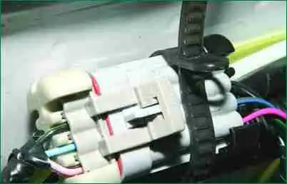 Розстібаємо або розрізаємо пластмасовий хомут, що кріпить колодку дротів форсунок до щитка передка.