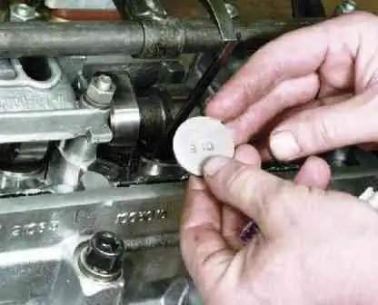 Вставивши ребро іншої викрутки (з шириною леза не менше 10 мм) між краєм штовхача та розподільчим валом, фіксуємо штовхач та виймаємо пінцетом регулювальну шайбу.