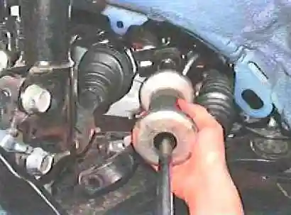 Якщо немає знімника палець шарового шарніра, можна вибити різкими ударами молотка по торцю бобишки поворотного важеля, завдаючи ударів уздовж важеля