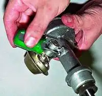Крестообразной отверткой ослабляем винт крепления хомута топливного шланга и снимаем шланг со штуцера топливозаборника.