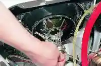 Аналогично отсоединяем штуцер трубки от шланга сливного трубопровода.