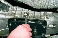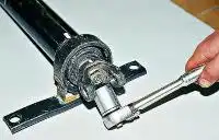 Головкой «на 19» отворачиваем гайки с четырех шпилек крепления поперечины к лонжеронам.