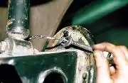 Двумя ключами на 15 ослабляем гайку болта крепления опоры к кронштейну генератора и отводим ее вниз.