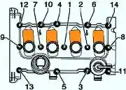 Проверьте положение выпускного распредвала. Обе отметки 1 и 2 должны совпадать.